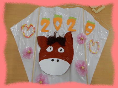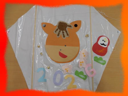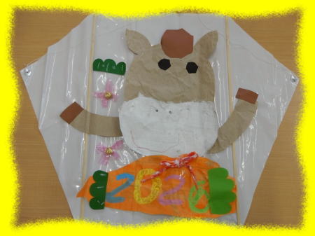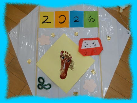 かに組はだるまさんの姿をした戌のたこを作りました。今回のたこ制作で初めて飾り切りに挑戦しました!!「どんな形になるかな~」とワクワクし、完成した形をみて「すごい!」ととっても嬉しそうにしてくれていました。パーツ切りや三つ編みもすっかり上手になり、ほとんど1人ですすめてくれていましたよ!とってもかわいいたこが完成し「高くあがるかな」とワクワクしているかに組さんです!  た!!